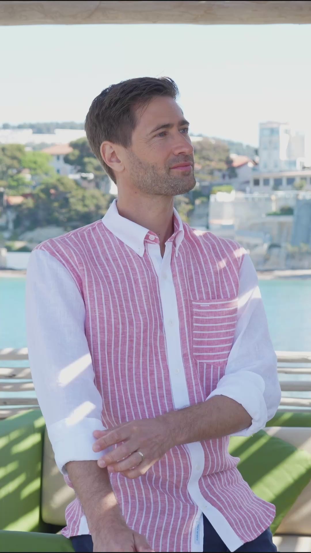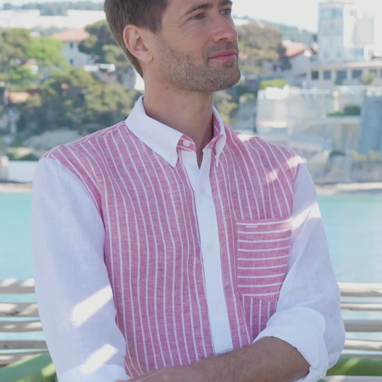 The name "Santorini", the mythical island of the Cyclades, for this linen shirt with a color contrast effect that combines chic with originality.