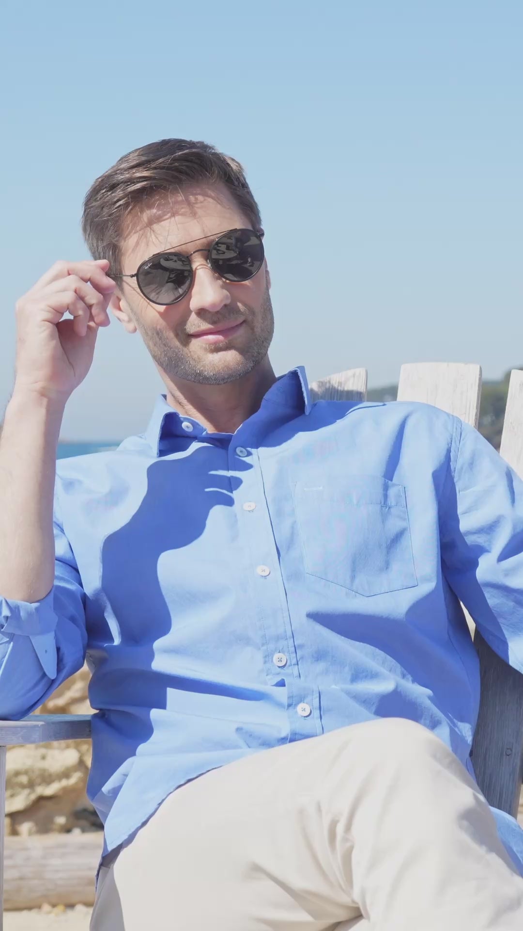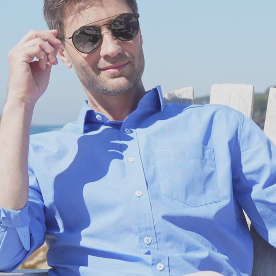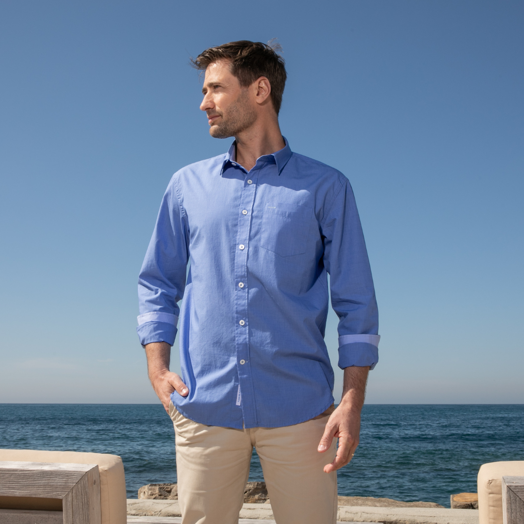 La dénomination « Houlgate », charmante station balnéaire située sur la côte normande dans le Calvados, pour cette chemise légère en fil-à-fil aux détails soignés, à l’allure élégante, estivale et intemporelle.